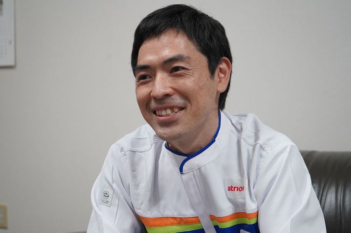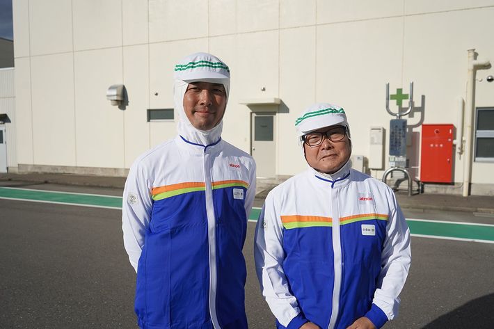 「アトリオン製菓」の山下奉丈社長と製造部長の久保田啓一さん