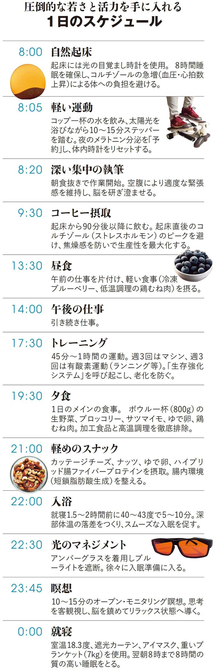 若さを保つには肉体への刺激が不可欠。夕方はマシントレーニングなどで体に負荷をかけ、眠っている強化システムを呼び起こし、老化を防ぐ。