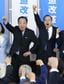 新党「中道改革連合」の結党大会で、気勢を上げる野田佳彦共同代表(左)と斉藤鉄夫共同代表=2026年1月22日、国会