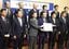 締結式で握手を交わす左からJR東海の丹羽社長、鈴木知事、国土交通省の水嶋事務次官