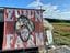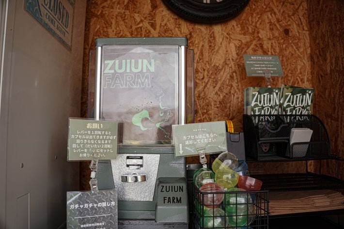 自販機の建物は広大な畑の中にポツンとあるが、ポップなイラストの日除け看板でインパクト抜群