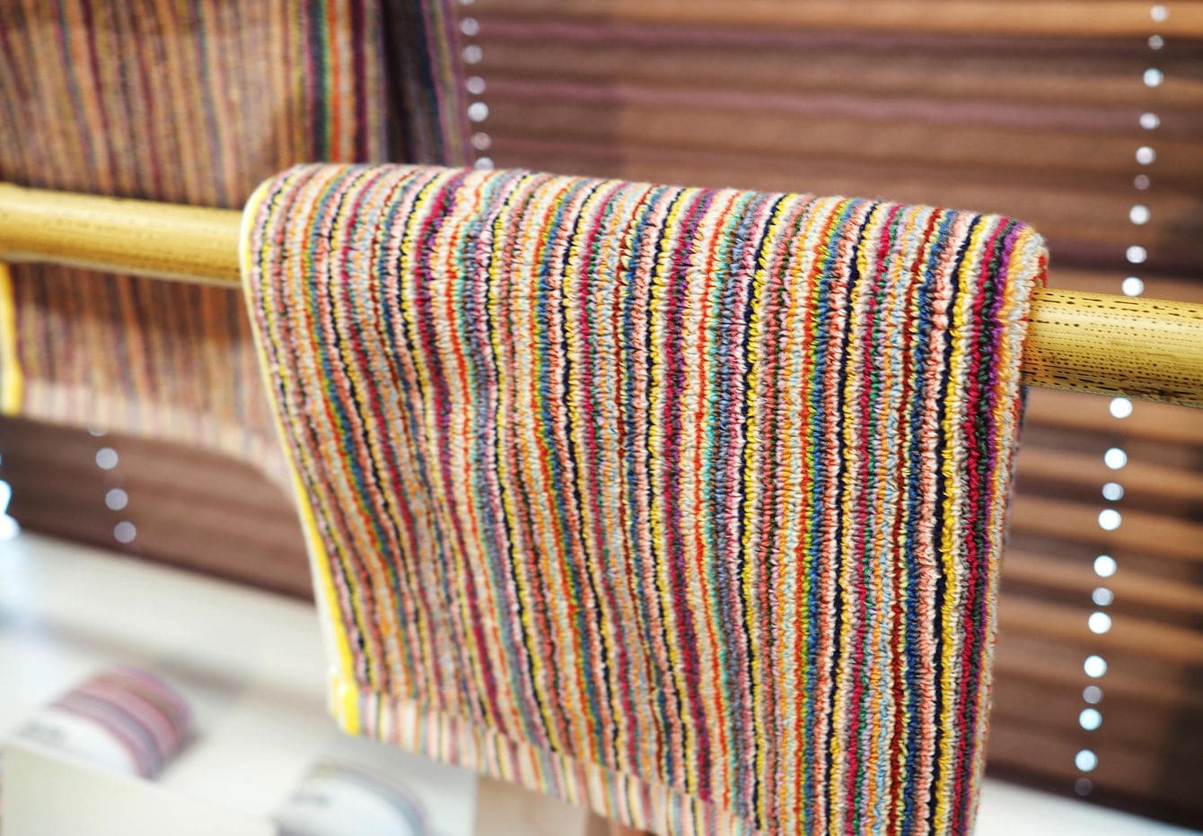 七福タオルの社内。カラフルなタオルが並ぶ