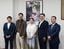NHK連続テレビ小説「ばけばけ」でヒロインの松野トキ役を演じる高石あかりさん(中央)と、夫ヘブン役を務めるトミー・バストウさん(左から2人目)が、島根県庁に丸山達也知事(右から2人目)を表敬訪問した。=2025年9月1日