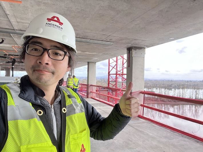 井上さんはソフトウェアだけでなく、現場仕事も手がける。写真はオレゴン州ポートランドのタワマン建築現場