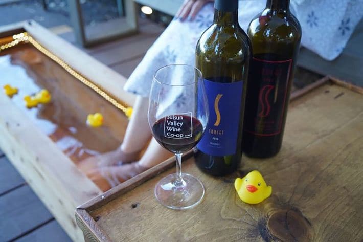 「Zen Zin Onsen」では、足湯に浸かりながらワインを楽しむことができる