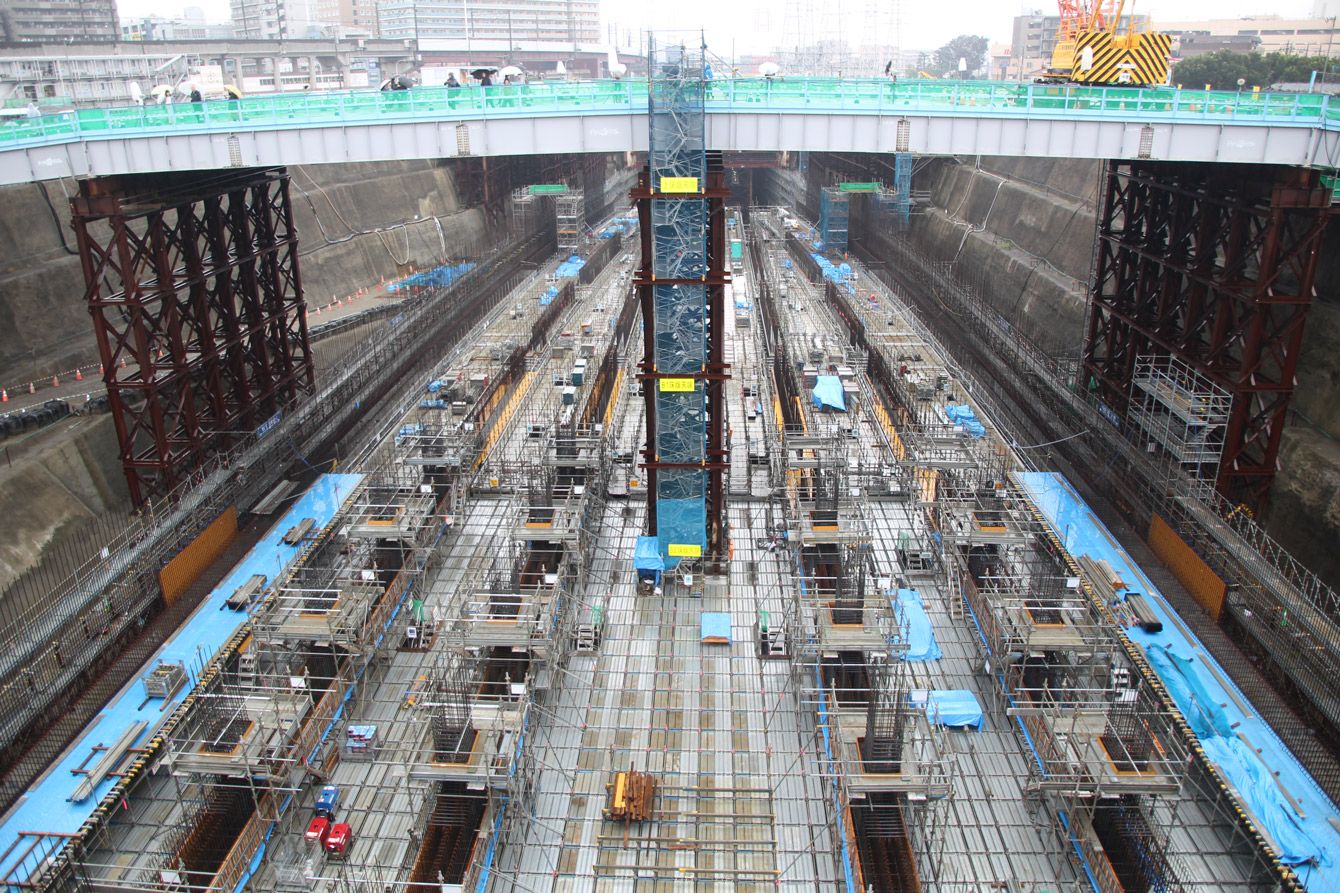 建設中の神奈川県駅(仮称)。土台部分をみると、将来設置されるホームの場所がわかる。さがみはらリニアフェスタ2025にて。2025年10月25日撮影。