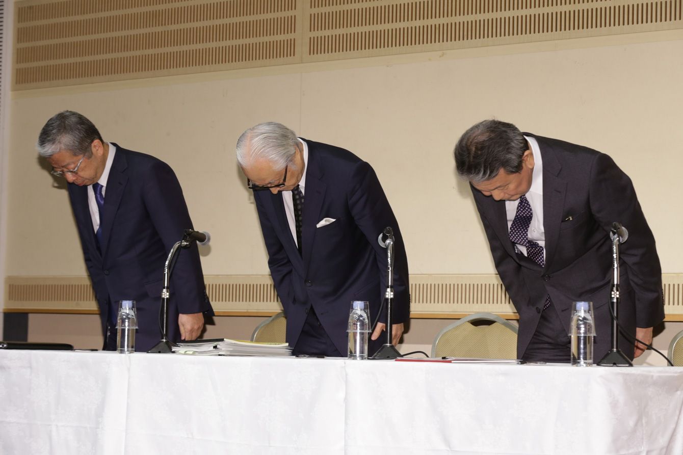 かんぽ生命の保険の不適切販売について謝罪する(右から)かんぽ生命 植平光彦 取締役兼代表執行役社長、日本郵政 長門正貢 取締役兼代表執行役社長、日本郵便 横山邦男 代表取締役社長兼執行役員社長。(=2019(令和元)年12月27日、東京都内。役職は会見当時)