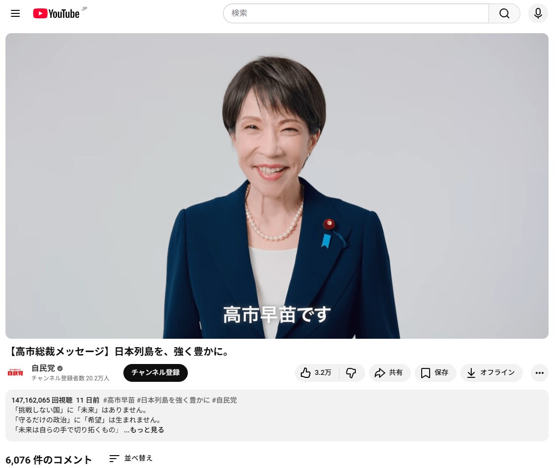 再生回数が1.4億回を超えた「高市総裁のメッセージ」(出所=自民党公式YouTubeチャンネル)