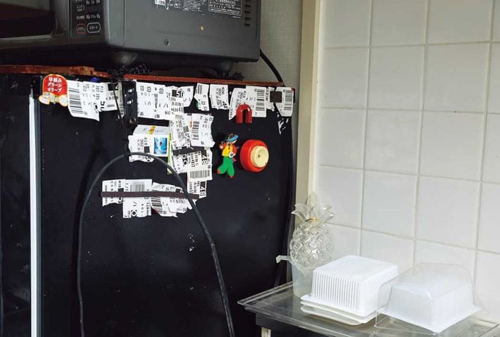 冷蔵庫には、再利用のために貼られたシールがずらり。