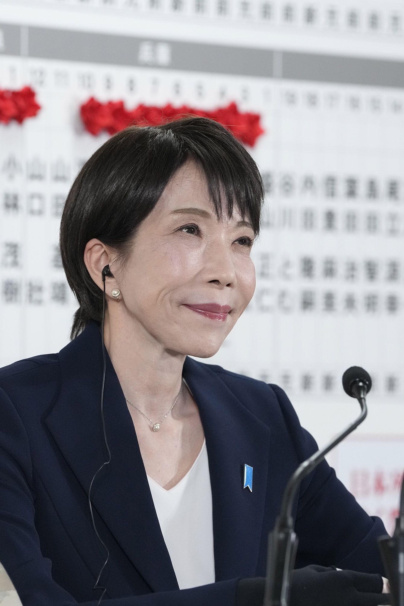 当確者の名前にバラを付ける自民党総裁の高市早苗首相(左から4人目)ら=2026年2月8日、東京・永田町の党本部