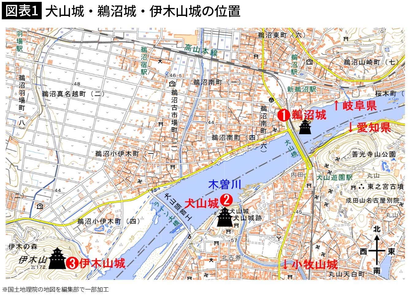 右手に犬山城。奥の橋の左たもとに鵜沼城