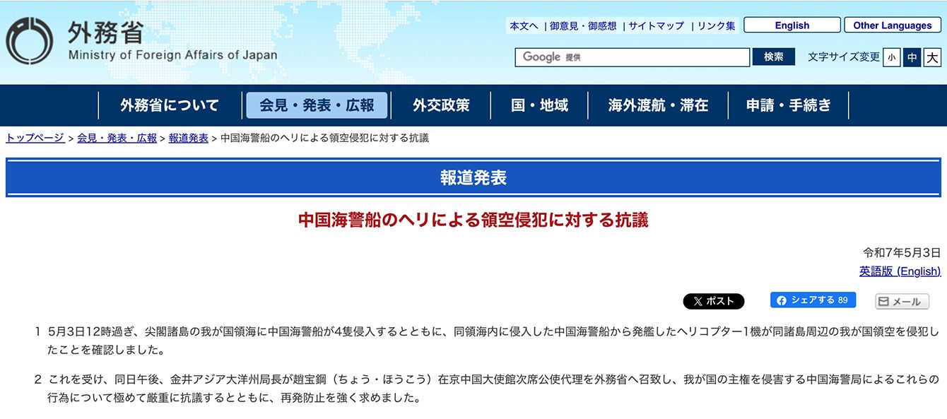 中国海警船のヘリコプターによる領空侵犯に対する外務省のコメント(2025年5月3日)(
