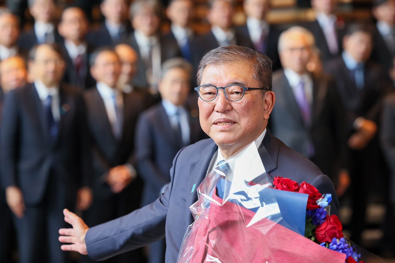 2025年10月21日、首相退任の日に花を受け取った石破茂(写真=首相官邸/CC-BY-4.0/