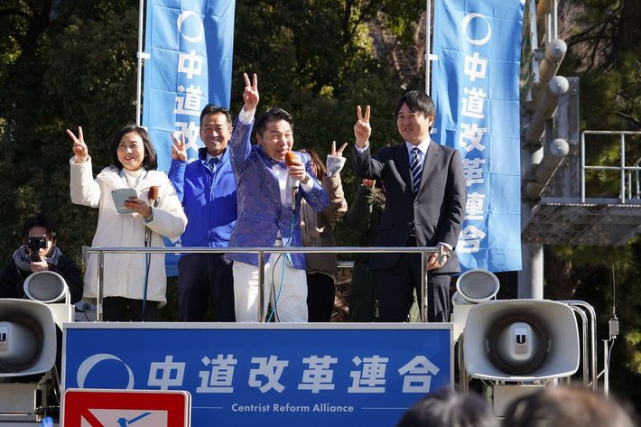 芝公園で街頭演説をする中道改革連合の大森江里子氏、岡本三成氏、伊佐進一氏、本庄知史氏。2026年1月25日撮影。(写真=Noukei314/CC-BY-4.0/