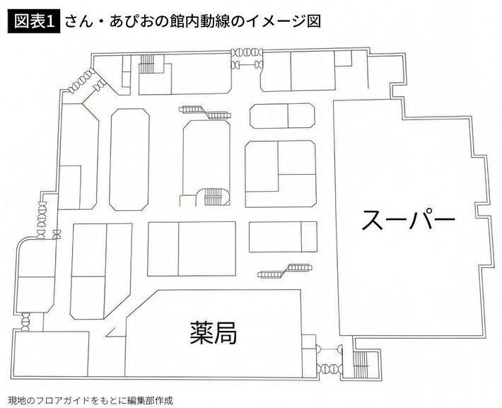 さん・あぴおの館内動線のイメージ図。定石とは離れた形状で、来店客にとって分かりにくい造りになってしまっている