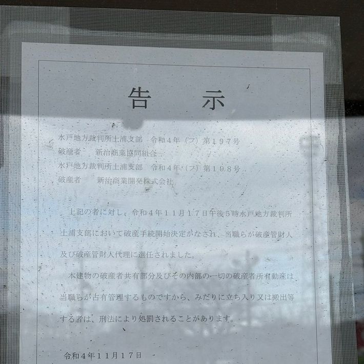 閉鎖された入り口に掲示されている、新治商業協同組合と新治商業開発に関する破産告示書類