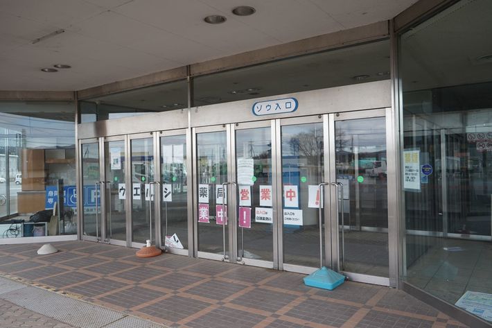 さん・あぴおにある閉鎖された「ゾウ入口」。ここから入ることはできないが、「薬局営業中」との文字が。写真左端には「ウエルシア」という文字があった形跡があるが、「ア」がなくなったままになっている