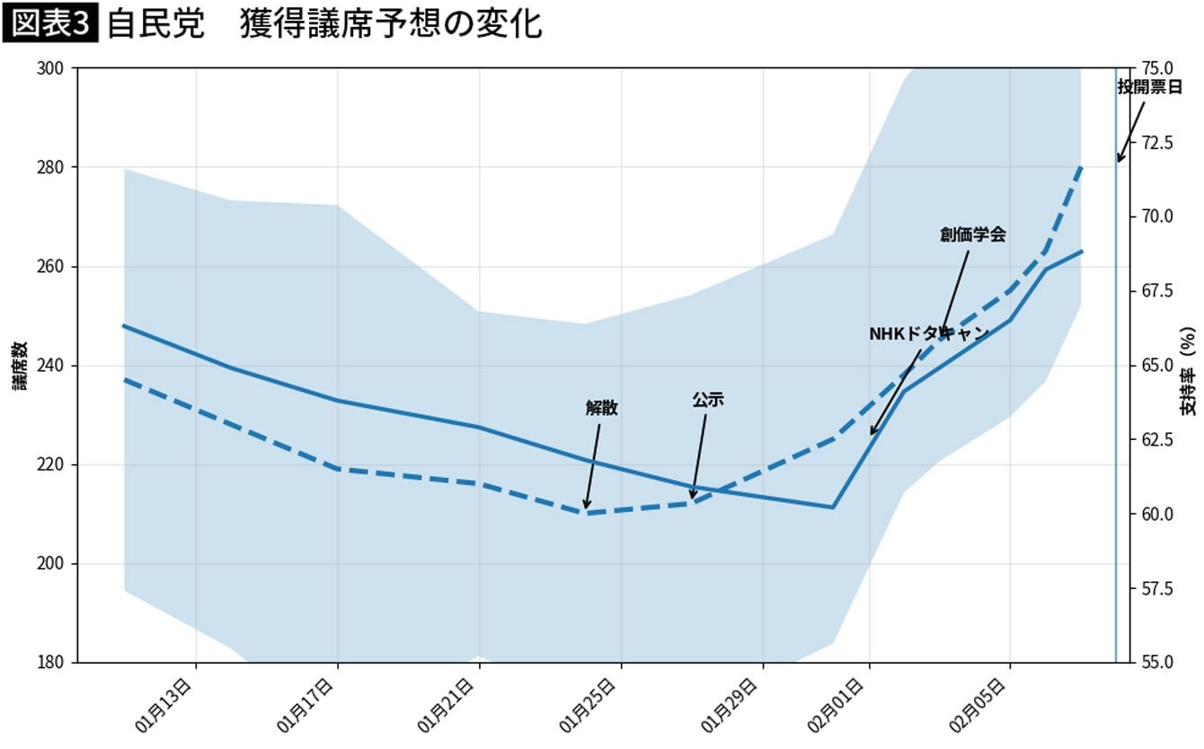 点線が獲得議席予想、実線が高市早苗政権のサンプル調査での内閣支持率、網掛け部分が獲得確率80%議席