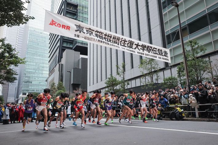 1区でスタートする選手たち=2026年1月2日、東京・大手町(第102回箱根駅伝)