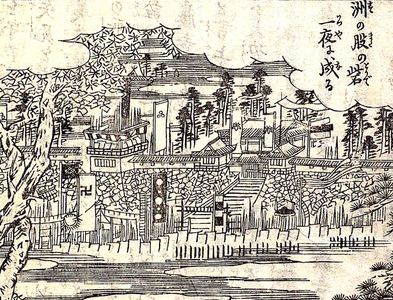『絵本太閤記』に登場する「洲の股の砦」は石垣や櫓まであるが、もちろんこれは空想の産物。国立公文書館所蔵
