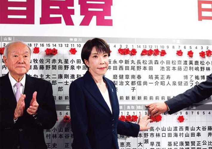 自民党の開票センターで、当選確実となりボードの自身の名前に花を付ける高市早苗首相。