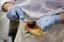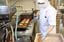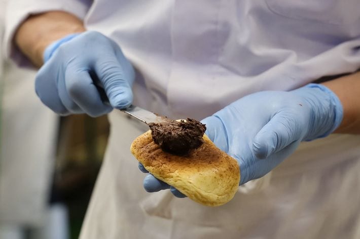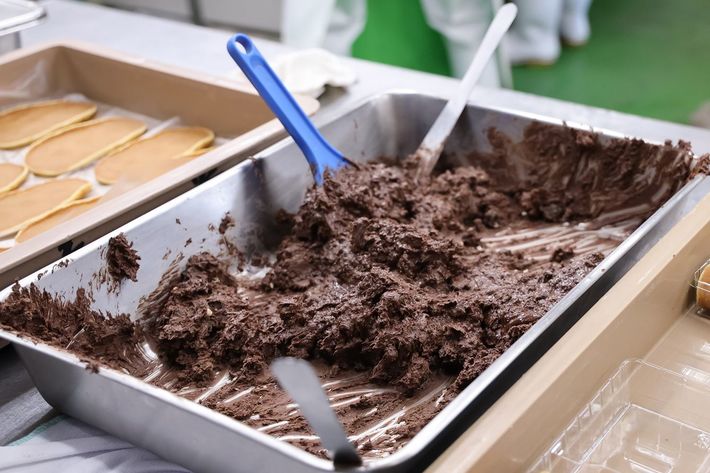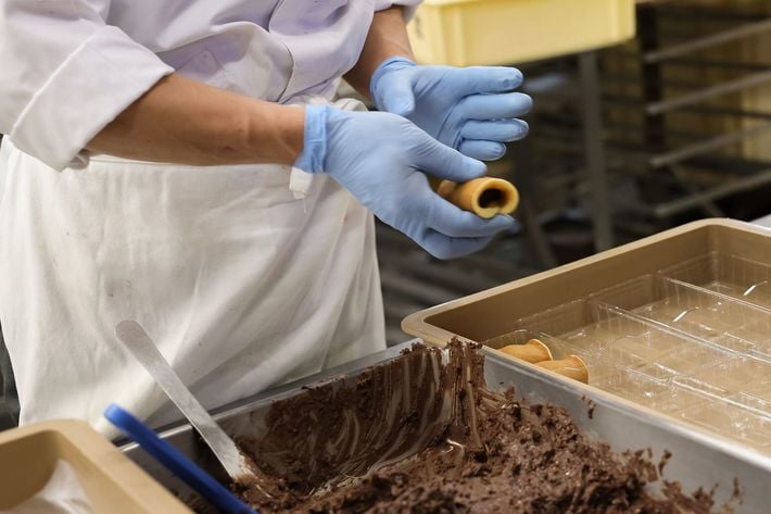 職人の手でブラックサンダー入りのチョコレートクリームを巻いていく