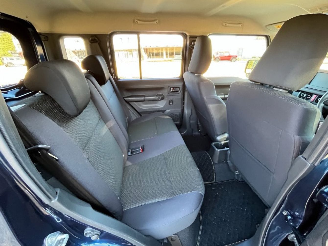 3ドアジムニーと決定的に違うのは後席の快適性。足もとスペースは余裕がある。