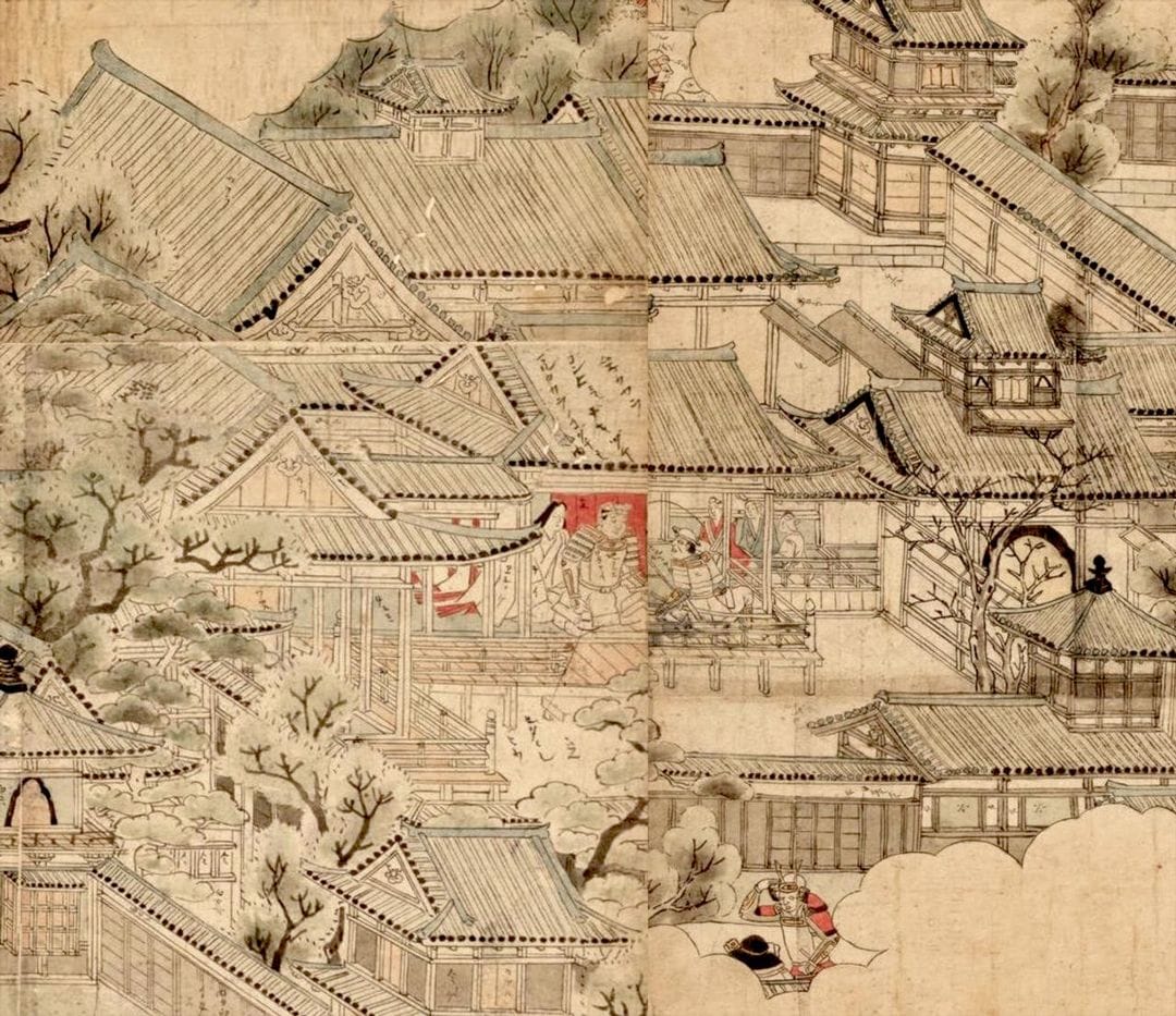 『大坂冬の陣図屏風(模本)』には、秀頼と思しき武将が描かれ、隣に女性がいる。この女性が淀殿か、または秀頼の妻・千姫かは不明。(出典=