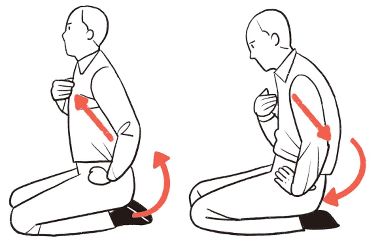 胸骨と骨盤の連動させる正座のイラスト。良い姿勢と正しい猫背の切り替えによって、骨格の感覚が掴めるようになる(出所=『