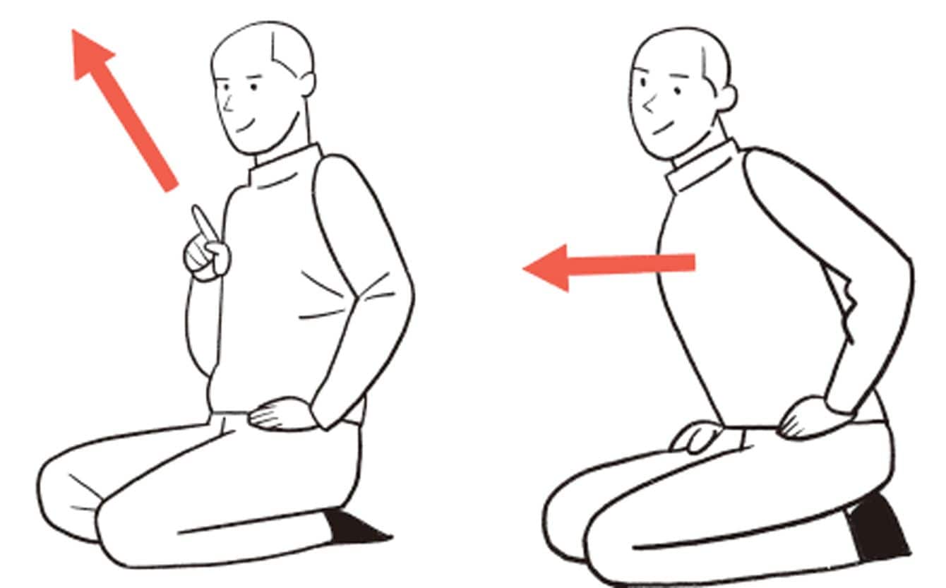 胸骨と骨盤の連動させる正座のイラスト。良い姿勢と正しい猫背の切り替えによって、骨格の感覚が掴めるようになる(出所=『