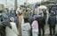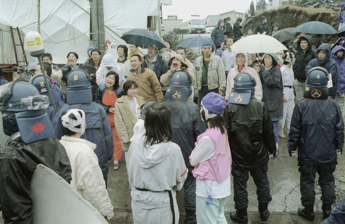 「第10サティアン」から保護された子供たちを返すよう要求するオウム真理教の信者たち=1995年4月14日午前11時40分、山梨県上九一色村(カラーネガ)(※オンライン記事にのみ掲載している画像です)