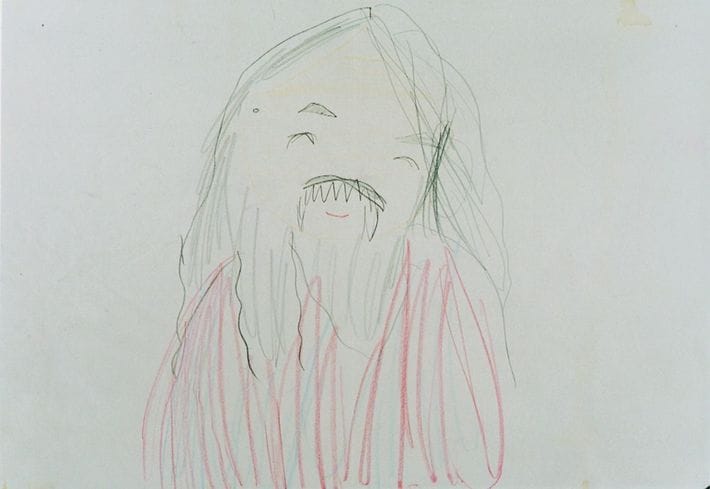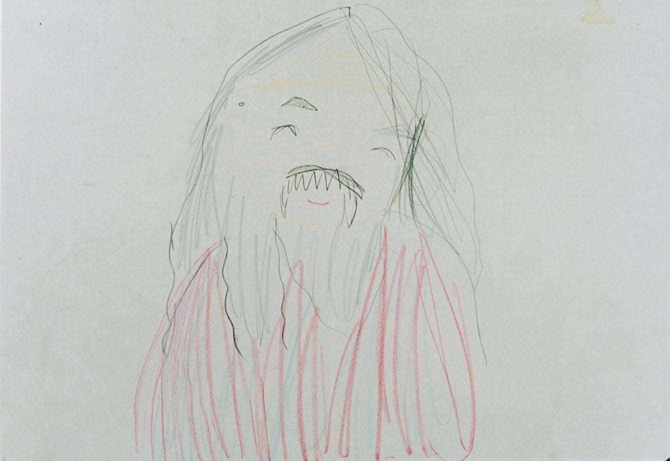 信者の子供がかいたにこやかな表情の麻原代表の絵。親しみを持っていることが感じられる(カラーネガ、1995年5月6日)(※オンライン記事にのみ掲載している画像です)