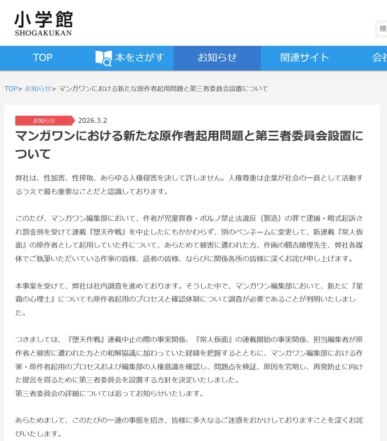 マンガワンにおける新たな原作者起用問題と第三者委員会設置について