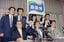 新党「自由党」結成を発表する柿沢弘治党首(前列中央)。看板を持つ高市早苗氏(後列右から2人目)、山本拓氏(後列左から1人目)=1994年4月20日、東京都千代田区の憲政記念館