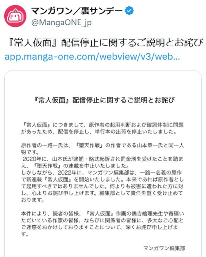 「『常人仮面』配信停止に関するご説明とお詫び」というマンガワン名義で公表されたリリース(一部)(画像=