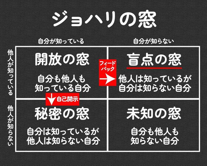 「ジョハリの窓」を視覚化した図。右上が「他人は知っているが自分は知らない自分」