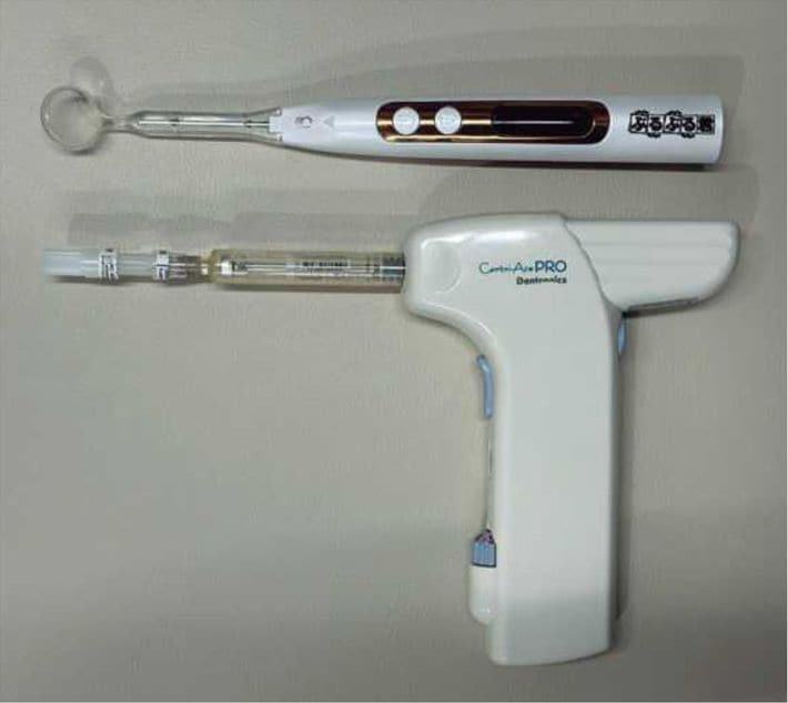 麻酔注射の不快感を軽減する「電動麻酔器」(下)と、「ぶるぶる君」(上)