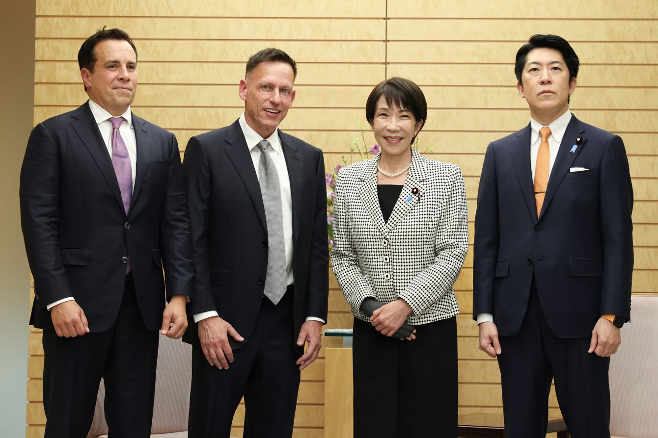 米データ解析大手パランティア・テクノロジーズ社のピーター・ティール会長(中央左)らの表敬を受ける高市早苗首相(同右)=2026年3月5日、首相官邸
