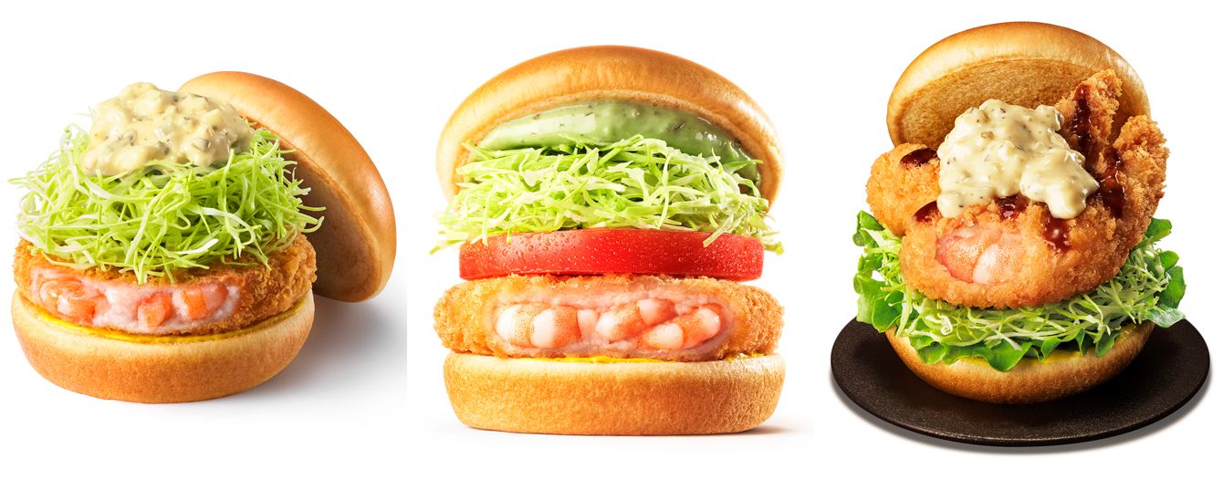 左から「海老カツバーガー」490円、「バジルマヨの海老カツバーガー 〜国産バジル〜」550円、「海老エビフライバーガー」670円