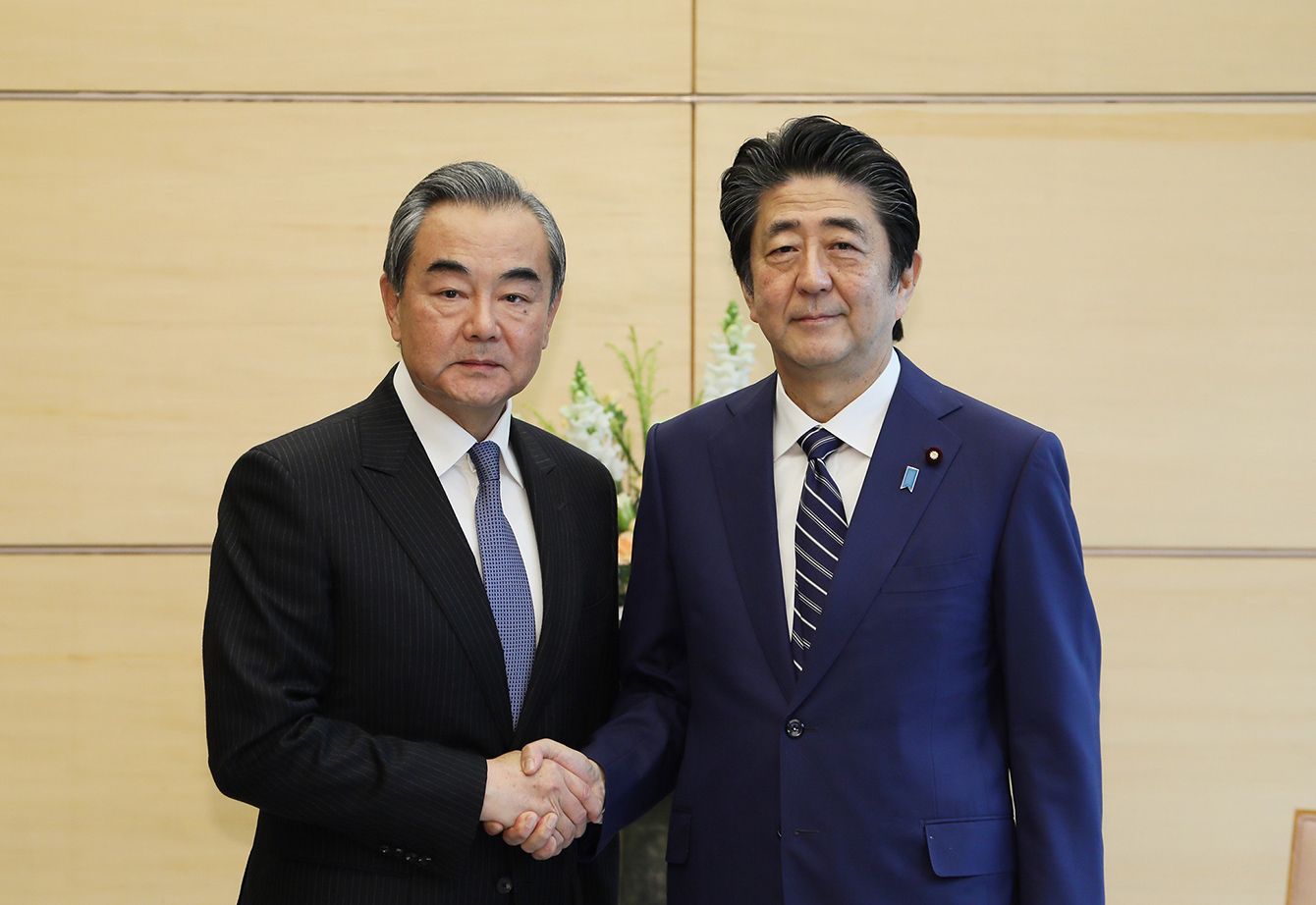 2019年11月25日、首相官邸で中華人民共和国の王毅国務委員兼外相を出迎える安倍首相(当時)(写真=首相官邸ホームページ/CC-BY-4.0/