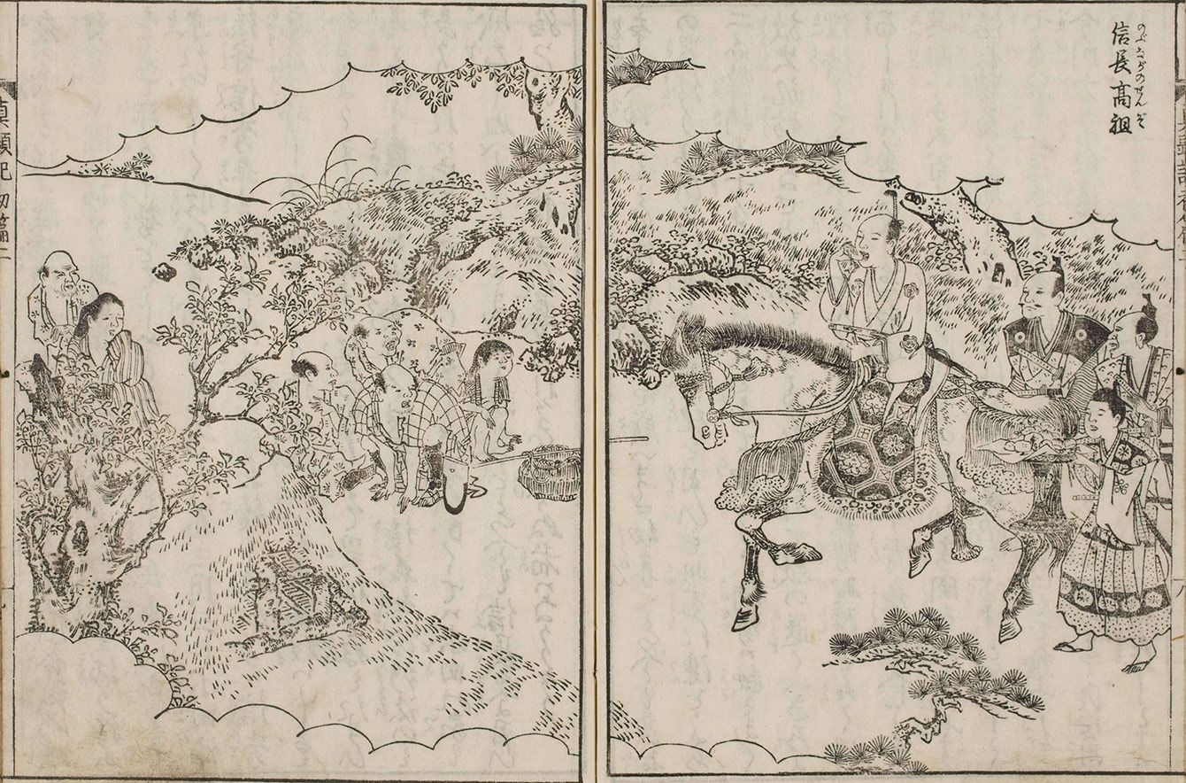 『絵本太閤記』の若き日の信長。派手な出立で供を侍らせ、馬上で何かたべている。