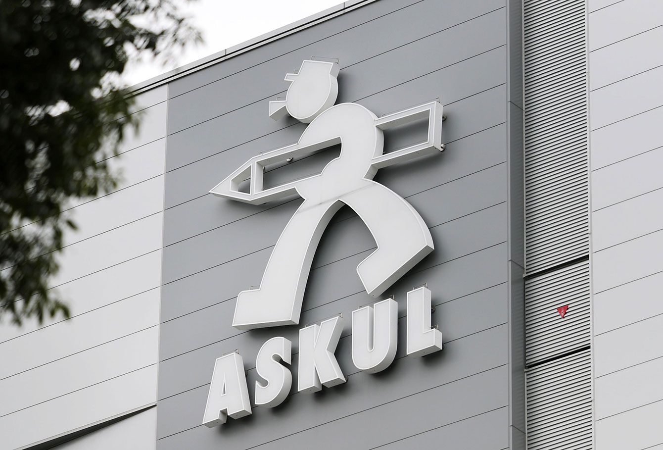 アスクルの物流センターにあるロゴマーク=2025年10月21日、東京都江戸川区
