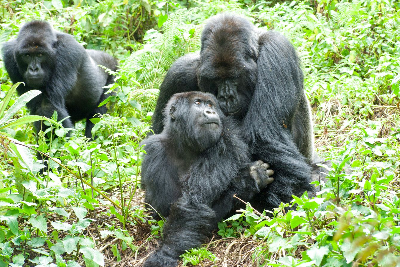 交尾しているゴリラたち。写真左側にいるオスは、ハーレム内で交尾が許されていないため2頭の様子をじっと見ている