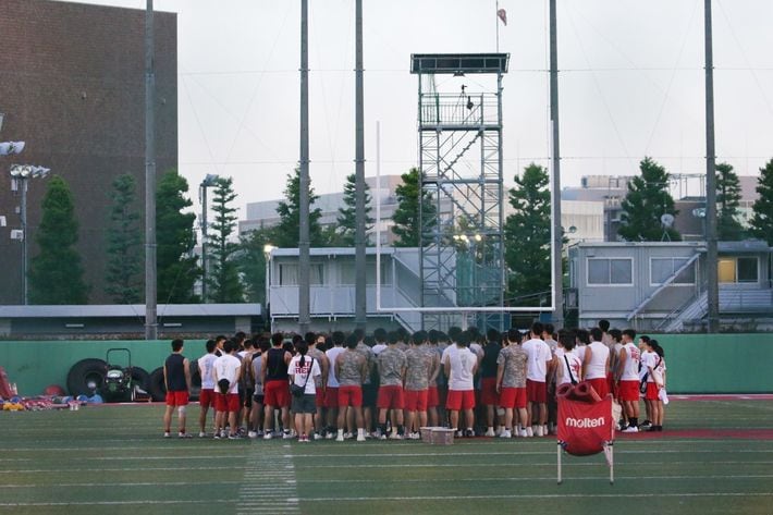 練習を再開し、全体練習で円陣を組む日本大学アメリカンフットボール部(2023年廃部)(=2018年6月29日、東京都世田谷区)