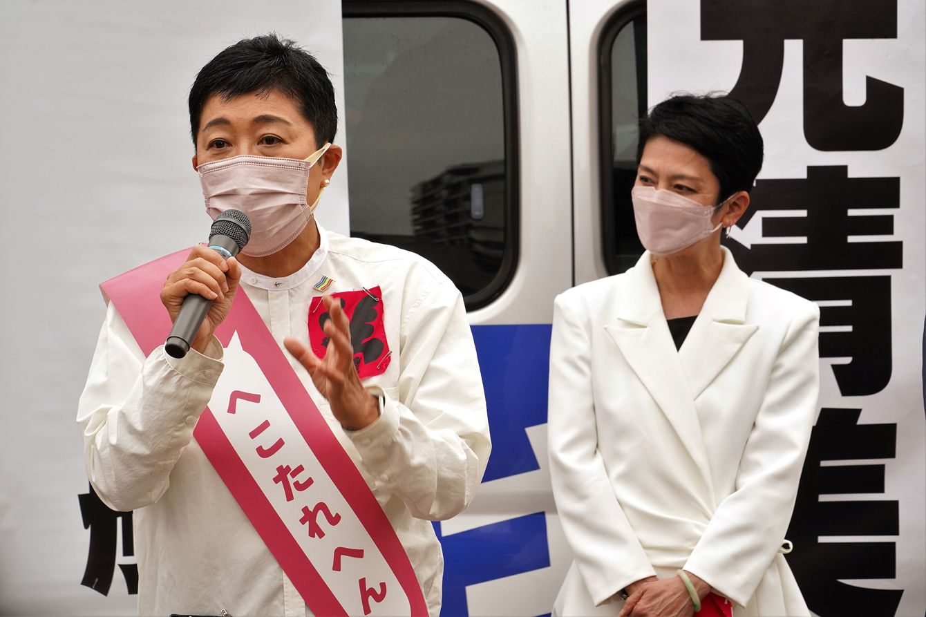三軒茶屋駅前で街頭演説をする辻元清美氏と蓮舫氏、2022年5月7日撮影。(写真=Noukei314/CC-BY-SA-4.0/