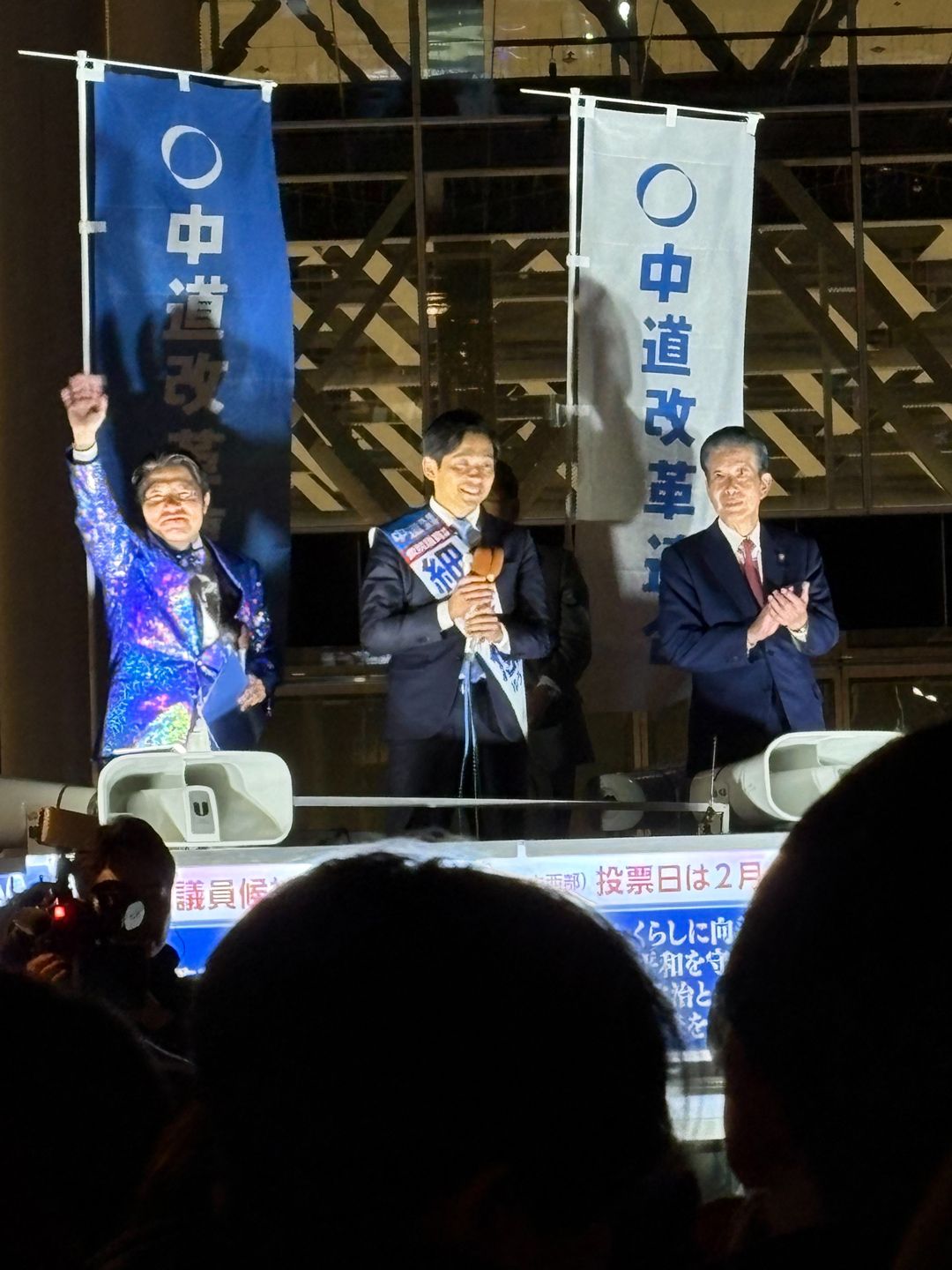 芝公園で街頭演説をする中道改革連合の岡本三成衆議院議員、本庄知史前衆議院議員、伊佐進一衆議院議員。2026年1月25日撮影。(写真=Noukei314/CC-BY-4.0/