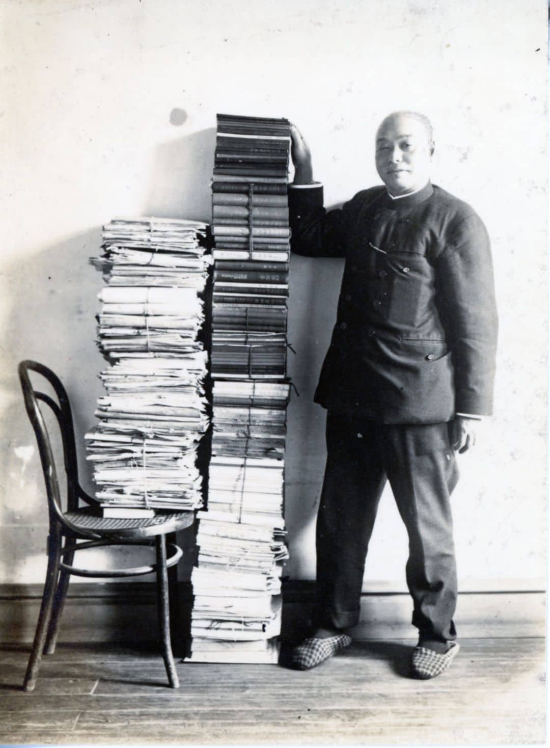 山積みの著作に手を添える本多静六。生涯で370冊もの自著を残した。