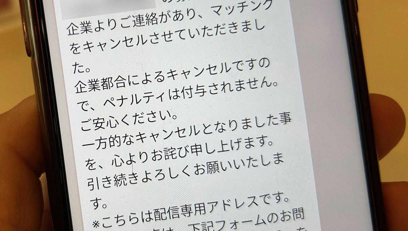 2025年9月以前のタイミーによるキャンセル通知のフォーマット。一方的な直前キャンセルにもかかわらず、理由の説明もなく、ワーカーたちからは戸惑いや不満の声が上がっていた