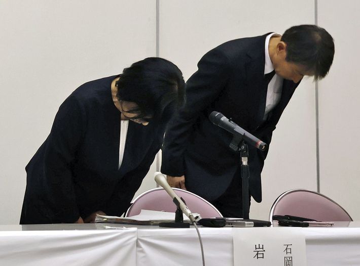 記者会見で謝罪する茨城県石岡市教育委員会の岩田利美教育長(左)ら=2026年3月30日午後、石岡市