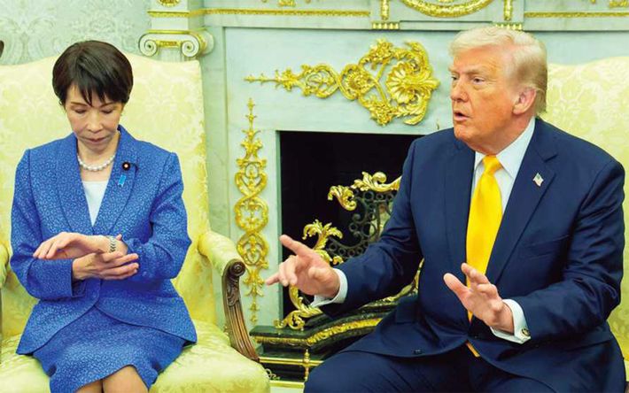 ドナルド・トランプ米大統領(右)との会談中、腕時計を見る高市早苗首相。